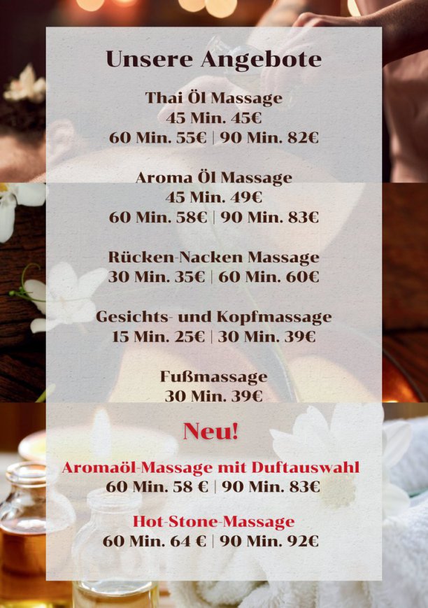Lassen Sie sich in meinem Massagestudio Luangkau Thaimassage und Wellness in Bad Rappenau professionell verwöhnen, genießen Sie die entspannende Wirkung einer traditionellen Thai- oder